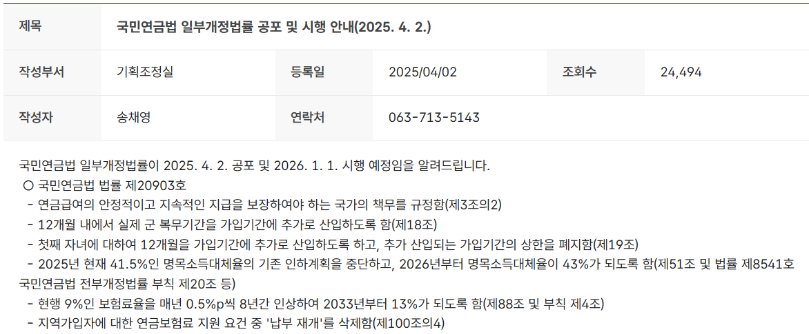 국민 연금법 일부 개정내용은 국민연금공단 홈페이지에 방문하면 자세히 설명되어있다.